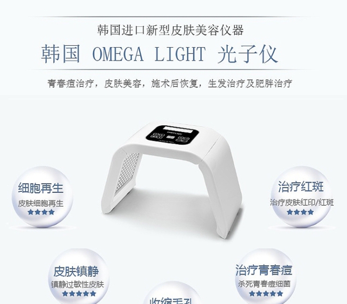 LED光療儀是由287種特殊醫(yī)療用SLD構(gòu)成,紅色(640nm),藍(lán)色(423nm),綠色(532nm),黃色(583nm)4種波長照射的醫(yī)療用LED。歐米茄光LLLT PDT光線治療開始對于傷口愈合,減少疼痛等,最近常用于青春痘治療,皮膚美容,施術(shù)后恢復(fù),生發(fā)治療及肥胖治療。